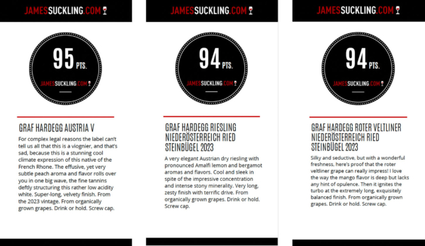 Jede Menge nationale und internationale Top-Bewertungen für unser Weingut Graf Hardegg. Die konsequente biologisch-organische Bewirtschaftung seit 2006, Kreislaufwirtschaft und der seit jeher exklusive Sortenspiegel machen sich bezahlt. Langer Atem lohnt sich … 😉 Aber sehen Sie selbst: